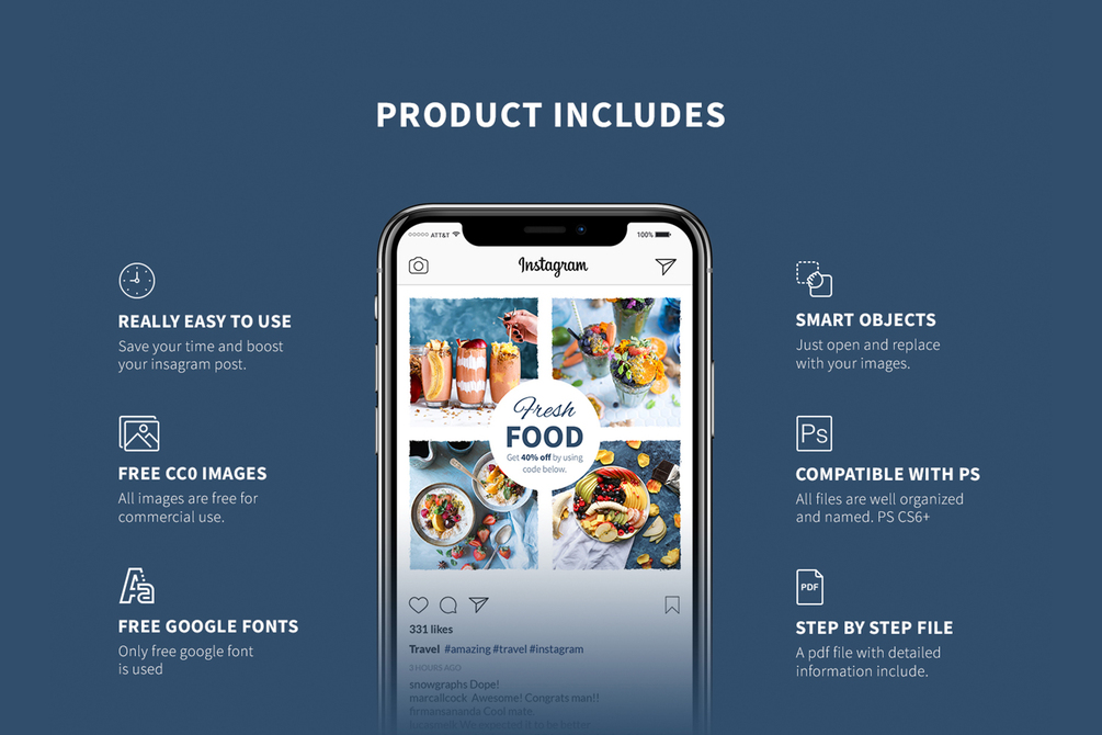 With Travel Instagram Posts you get 30 unique design templates. Get super clean and modern style for your Instagram. Change the text, colors, images, and shapes for the best result. The templates are fully customizable and compatible with Adobe Photoshop. Step by step .pdf is included to help you to get a unique post.