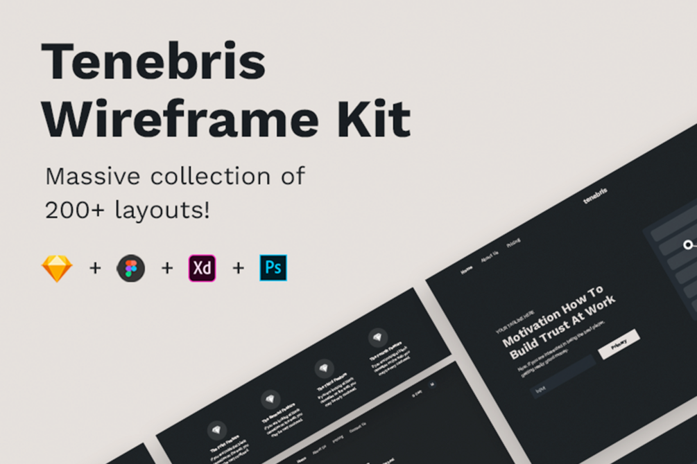 Speed up creating prototypes with Tenebris Wireframe Kit. It’s a massive collection of 200+ layouts in 13 popular categories. All elements are 100% vector based, fully editable and created using a bootstrap grid and work with Sketch and Figma.
